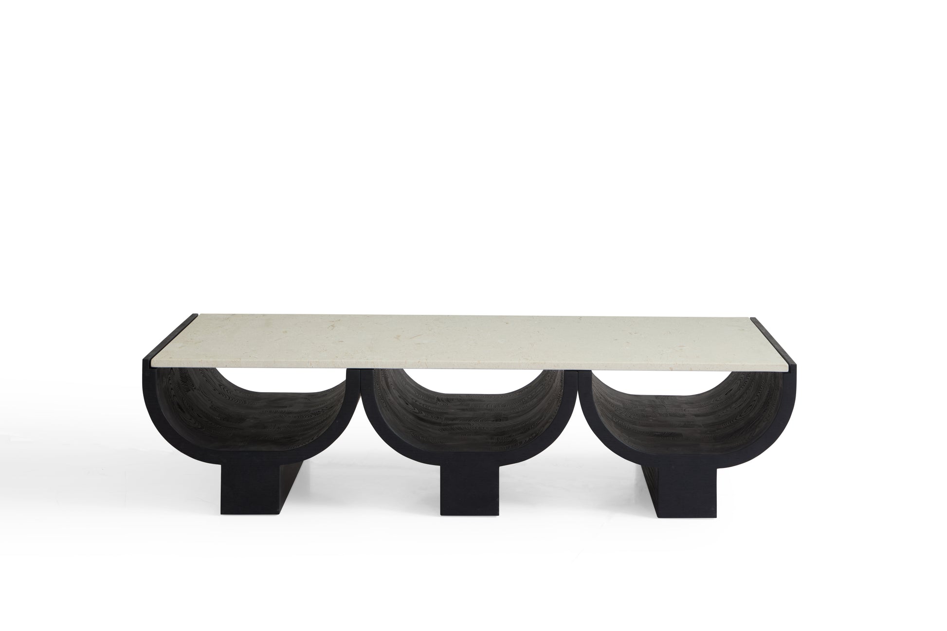 Modern Minimalist White Oak Coffee Table with Matte Black Finish and Moonlight Beige Marble Top