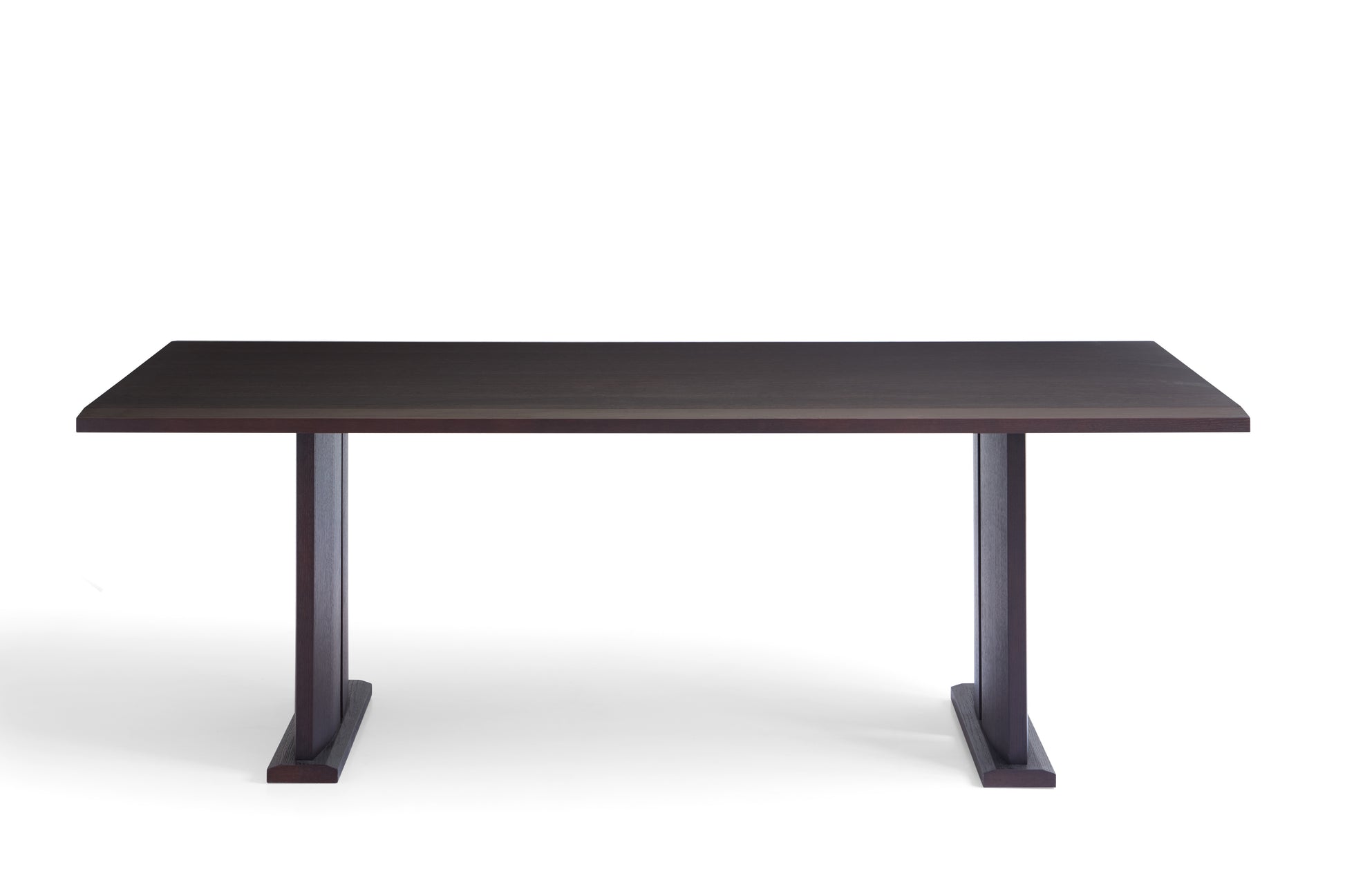 Crafted with the utmost precision, the table boasts a sturdy multi-layered solid wood construction, finished with a rich red oak veneer that exudes warmth and luxury. The deep, smoky matte finish is achieved through the use of a sophisticated open-pore lacquer, ensuring durability while enhancing the natural beauty of the wood grain.